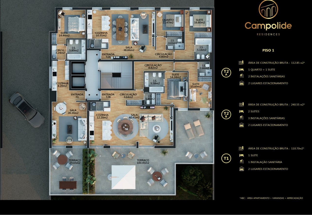 Interiores de Qualidade Superior: Roupeiros embutidos, chão em madeira e cozinhas abertas com bancadas em pedra, totalmente equipadas com eletrodomésticos modernos.